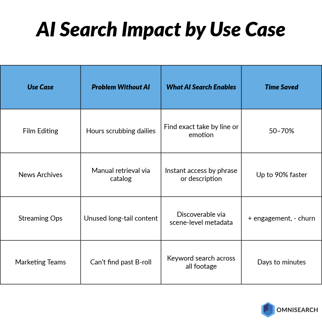 With Omnisearch, a team can instantly find every take where a specific line was delivered, or where a certain actor enters frame from a specific angle. Trailers can be built from untagged footage. Archived B-roll can be located in minutes. Post-production moves faster, and reshoots are avoided simply because people are able to use what’s already been captured.
